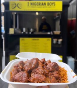 Two Nigerian boyys at Spitalfields Market dish out their famous Jollof Rice, renowned for its mouthwatering smoky flavour. You can enjoy this iconic rice paired with Chicken, Beef, Lamb, vegetables, or Plantain, available in combo, super combo, or mega combo options.